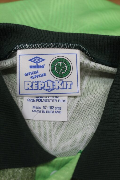 La Maglia Celtic away è risalente alla Stagione 1991/92 è disponibile nella taglia M, prodotto realizzato dalla Umbro originale dell’epoca , presenta ancora l’etichetta replikit , logo Celtic termoapplicato in flock a rilievo, logo umbro termoapplicato in flock, sponsor Peoples termoappliato in flock