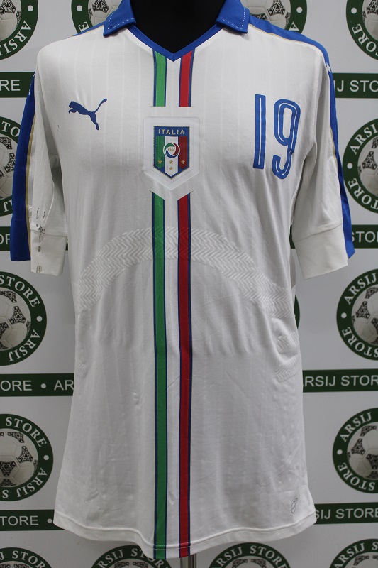 La Maglia Italia away di Leonardo Bonucci è disponibile nella taglia XL, prodotto realizzato dalla Puma originale dell’epoca , logo Italia in trama di maglia, logo Puma termoapplicato, nome e numero termoapplicato in plastichina