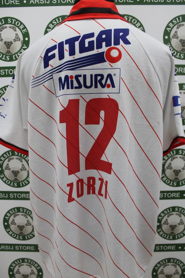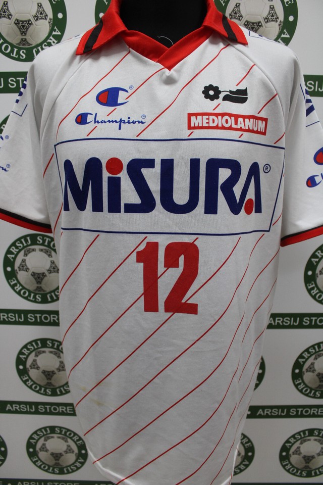 La Maglia Mediolanum away di Zorzi è disponibile nella taglia XL, prodotto realizzato dalla Champion originale dell’epoca , scritta mediolanum in trama di maglia, logo champion in trama di maglia, nome e numero in trama di maglia