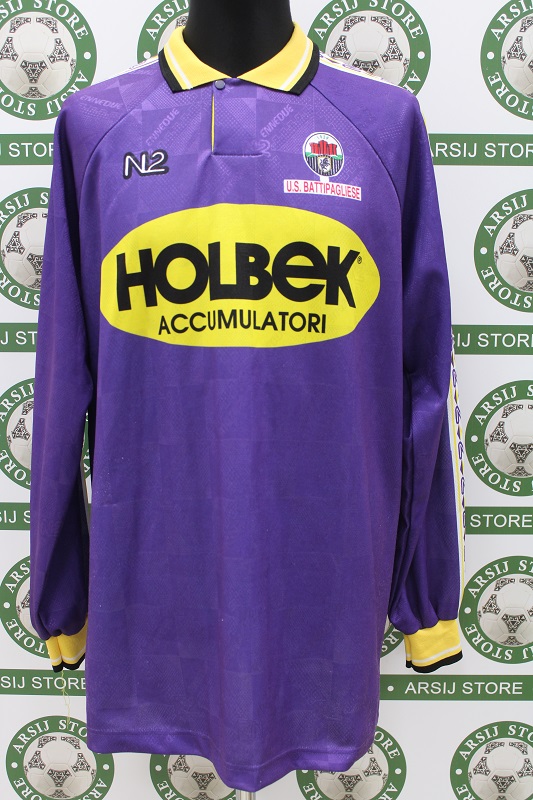 La Maglia Battipagliese home Match Worn è disponibile nella taglia XL, prodotto realizzato dalla N2 originale dell’epoca , logo Battipagliese in trama di maglia, logo n2 in trama di maglia, sponsor Holbek in trama di maglia, numero in trama di maglia