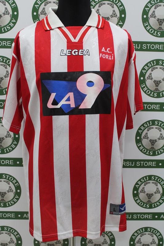La Maglia Forli home nella taglia L, prodotto realizzato dalla Legea originale dell’epoca , logo Forli termoapplicato in plastichina, logo legea ricamato, sponsor termoapplicato in plastichina,nome e numero termoapplicato in plastichina