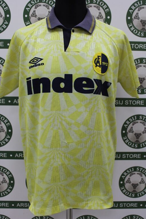 La Maglia Modena home Match Worn è disponibile nella taglia M, prodotto realizzato dall‘Umbro originale dell’epoca , logo Modena cucito in rilievo, logo umbro termoapplicato in flock, numero termoapplicato in flock
