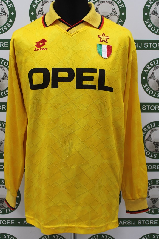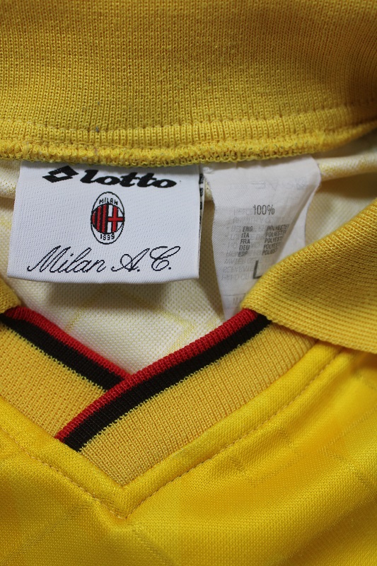 La Maglia Milan Third è risalente alla Stagione 1994/95 è disponibile nella taglia L, prodotto realizzato dalla Lotto originale dell’epoca , logo Scudetto e stella cucite in rilievo , logo lotto ricamato, sponsor in trama di maglia