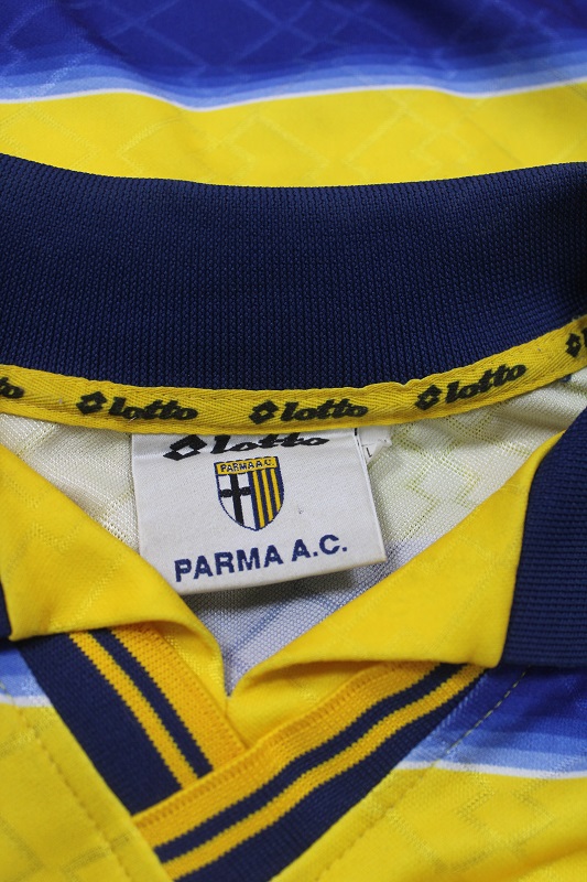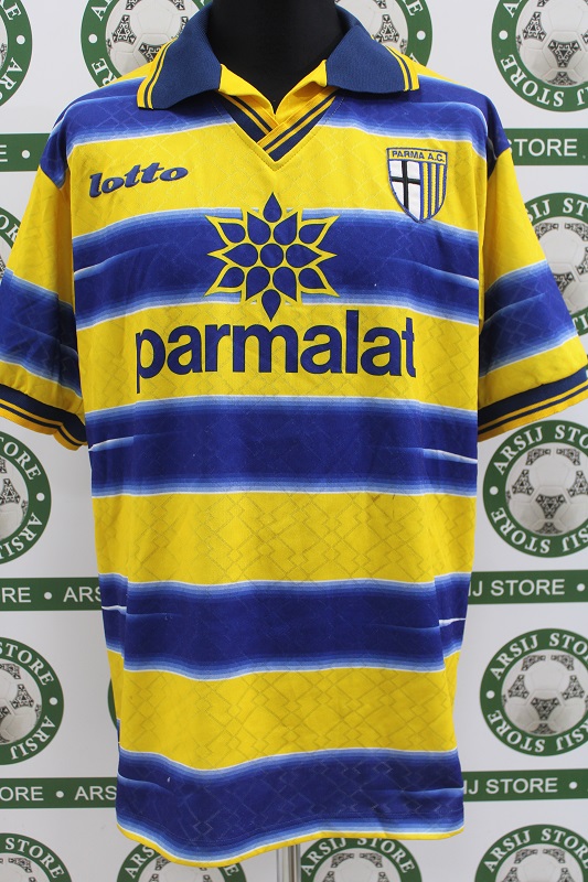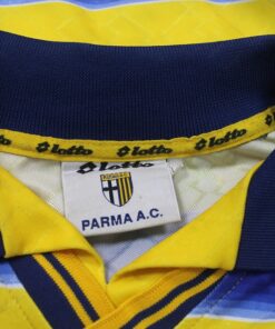 La Maglia Parma home di Sebastian Veron è risalente alla Stagione 1998/99 è disponibile nella taglia L, prodotto realizzato dalla Lotto originale dell’epoca , logo Parma cucito in rilievo, logo lotto termoapplicato in flock a rilievo, sponsor in trama di maglia, nome e numero termoapplicati in plastichina