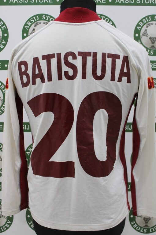 La Maglia Roma away di Gabriel Batistuta è risalente alla Stagione 2001/02 è disponibile nella taglia S, prodotto realizzato dalla Kappa originale dell’epoca , logo Roma cucito in rilievo, logo Kappa ricamato, sponsor Ina Assitalia termoapplicato in plastichina, nome e numero termoapplicato in plastichina