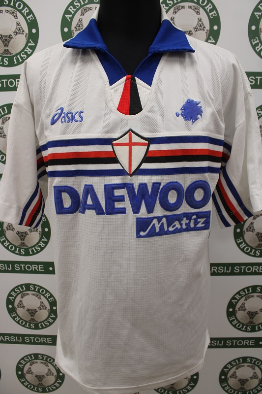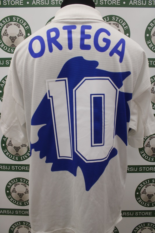 La Maglia Sampdoria away di Ariel Ortega è risalente alla Stagione 1998/99 è disponibile nella taglia S, prodotto realizzato dalla Asics originale dell’epoca , logo Sampdoria termoapplicato in flock a rilievo, logo Asics termoapplicato in flock a rilievo, sponsor Daewoo termoapplicato in flock a rilievo, nome e numero termoapplicati in plastichina