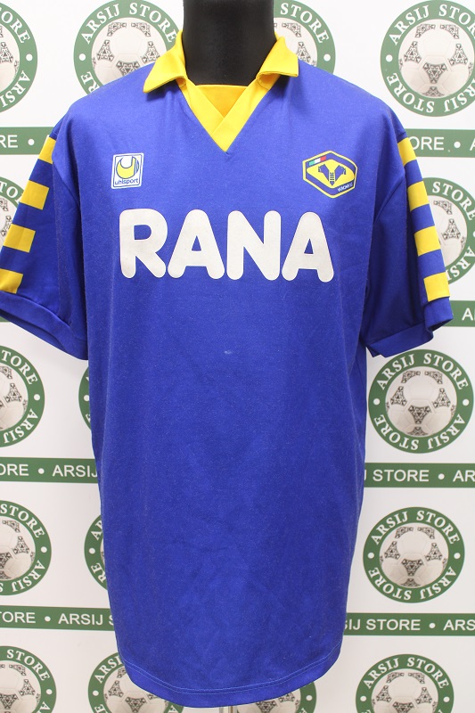 La Maglia Verona home Match Worn di Pietro Fanna è risalente alla Stagione 1991/92 è disponibile nella taglia XL, prodotto realizzato dalla Uhlsport originale dell’epoca , logo Verona in trama di maglia, logo uhlsport in trama di maglia, sponsor termoapplicato in flock, numeor termoapplicato in plastichina